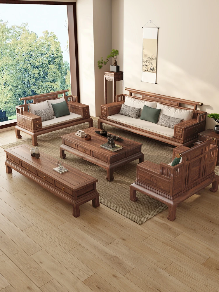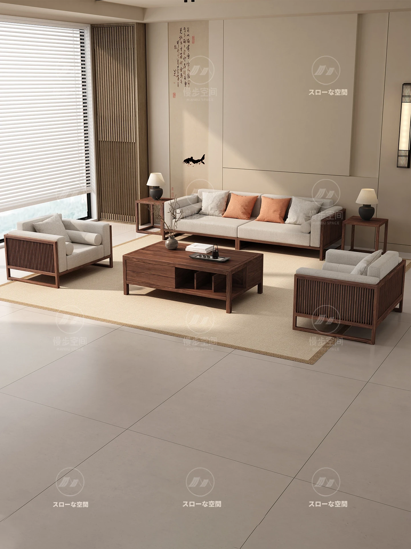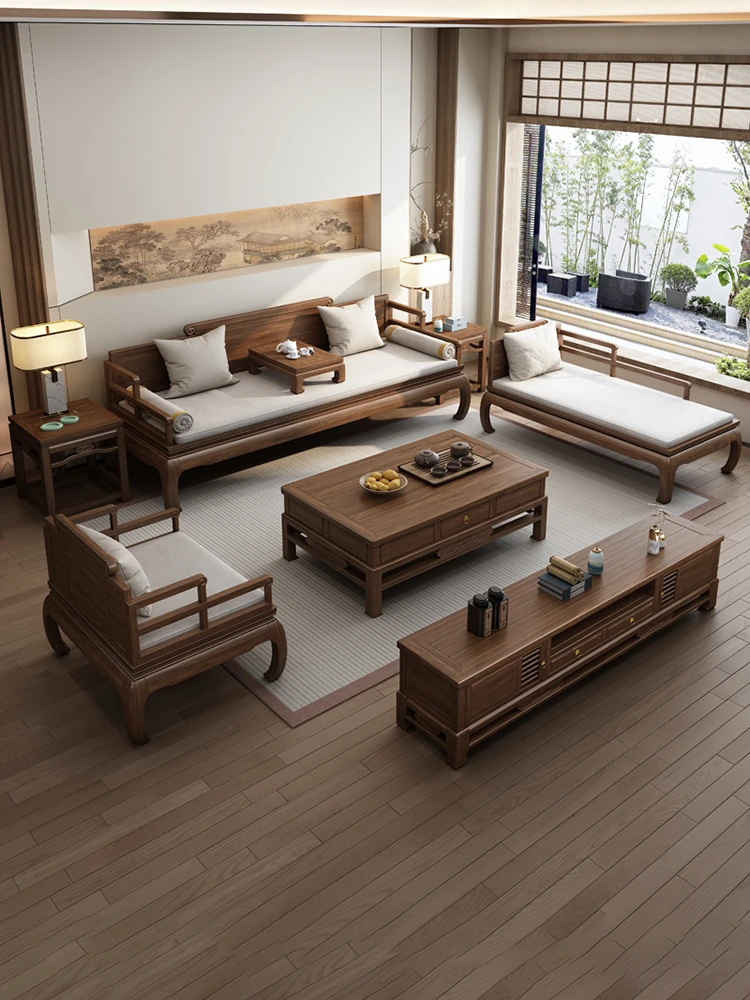 宋風美学の南米ウォールナット無垢材ソファセット - 高級新中式ヴィラ向けの洗練されたリビングルーム家具!心地よい居住空間を演出します。