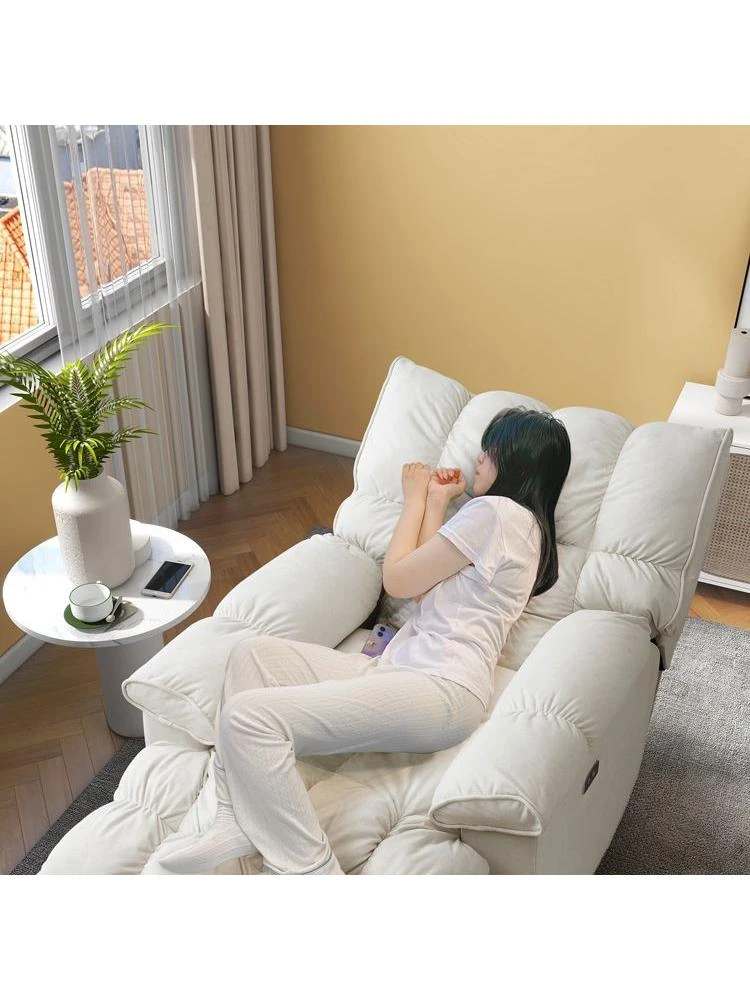 マルチ機能一人用ソファチェア - クリーム色でリラックス!寝転びもできる快適なリクライニング、リビングや寝室に最適。宇宙船のようなデザインで、心地よい揺れを楽しむラウンジソファです。