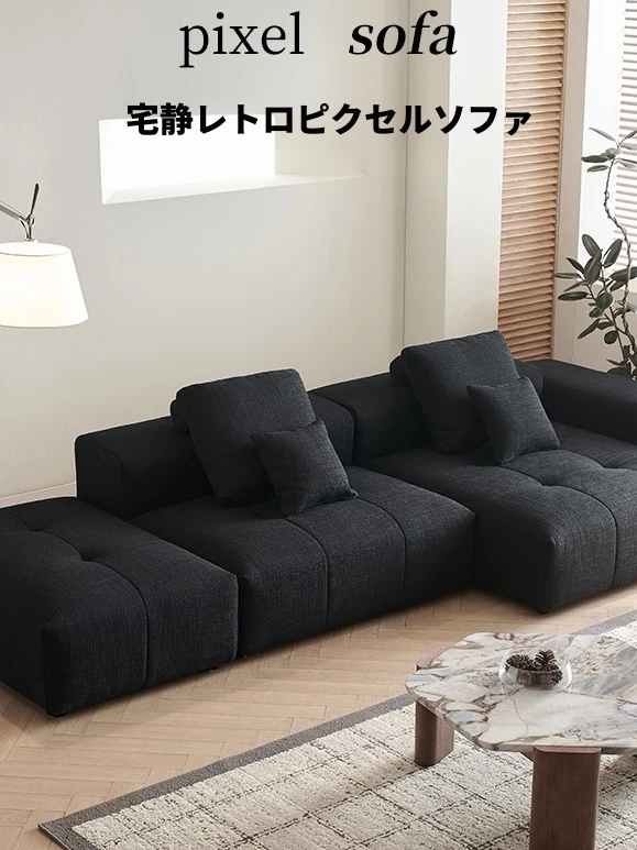 レトロスタイルのブラックピクセルソファー!豆腐ブロックデザインのコットンリネン生地を使用したモダンな角型コンビネーションソファー。快適さとスタイルを兼ね備えたリビングルームにぴったり!