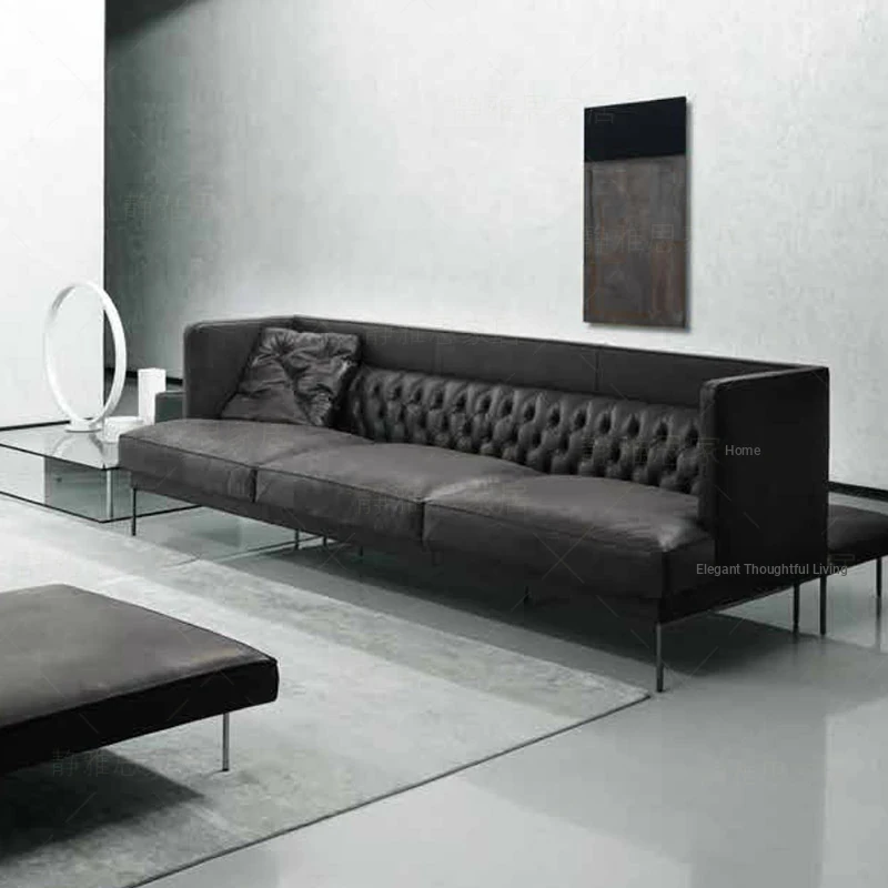 Italian Minimalist Genuine Leather Black Modular Sofa - Versatile Double-Sided Design for Modern Villas and Living Rooms, Perfect for Contemporary Elegance.