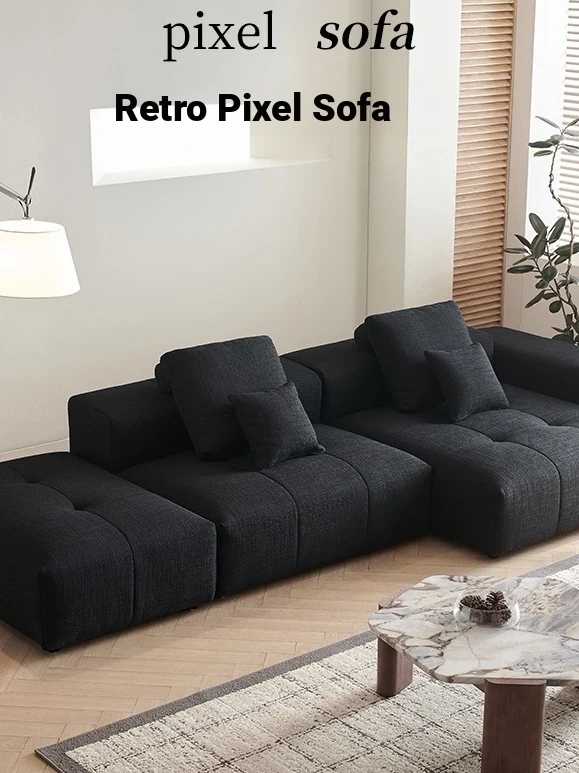 Retro Black Pixel Sofa - Modular Corner Couch with Tofu Block Design, Made of Cotton and Linen Fabric for Modern Living Rooms. Perfect for Stylish Comfort!