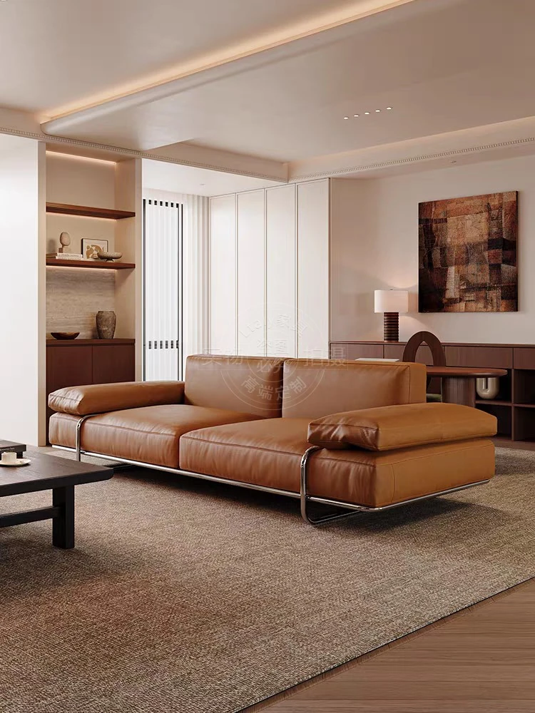 Minimalist Bauhaus-Inspired Leather Sofa - Mid-Century Modern Design for Stylish Living Rooms and Meeting Spaces, Featuring a Sleek Stainless Steel Frame