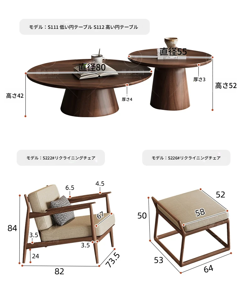 【スタンダード版】FASグレードのブラックウォールナットソファ2.6M+大・小テーブル+ラウンジチェア*2+小さなスツール*2