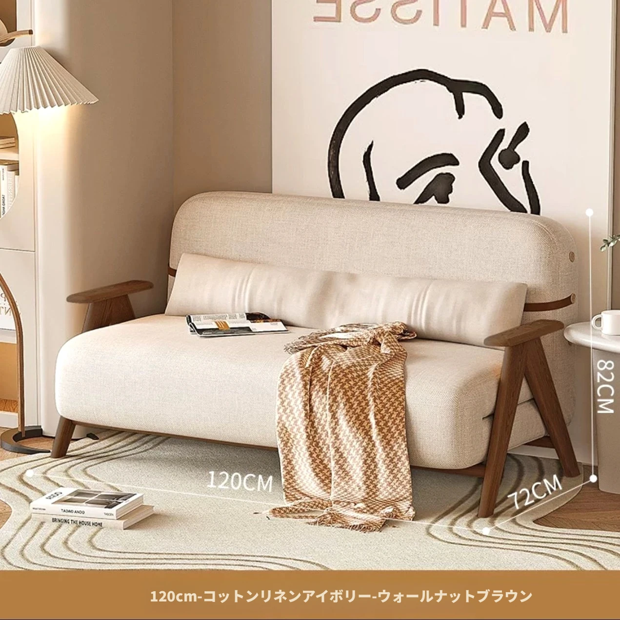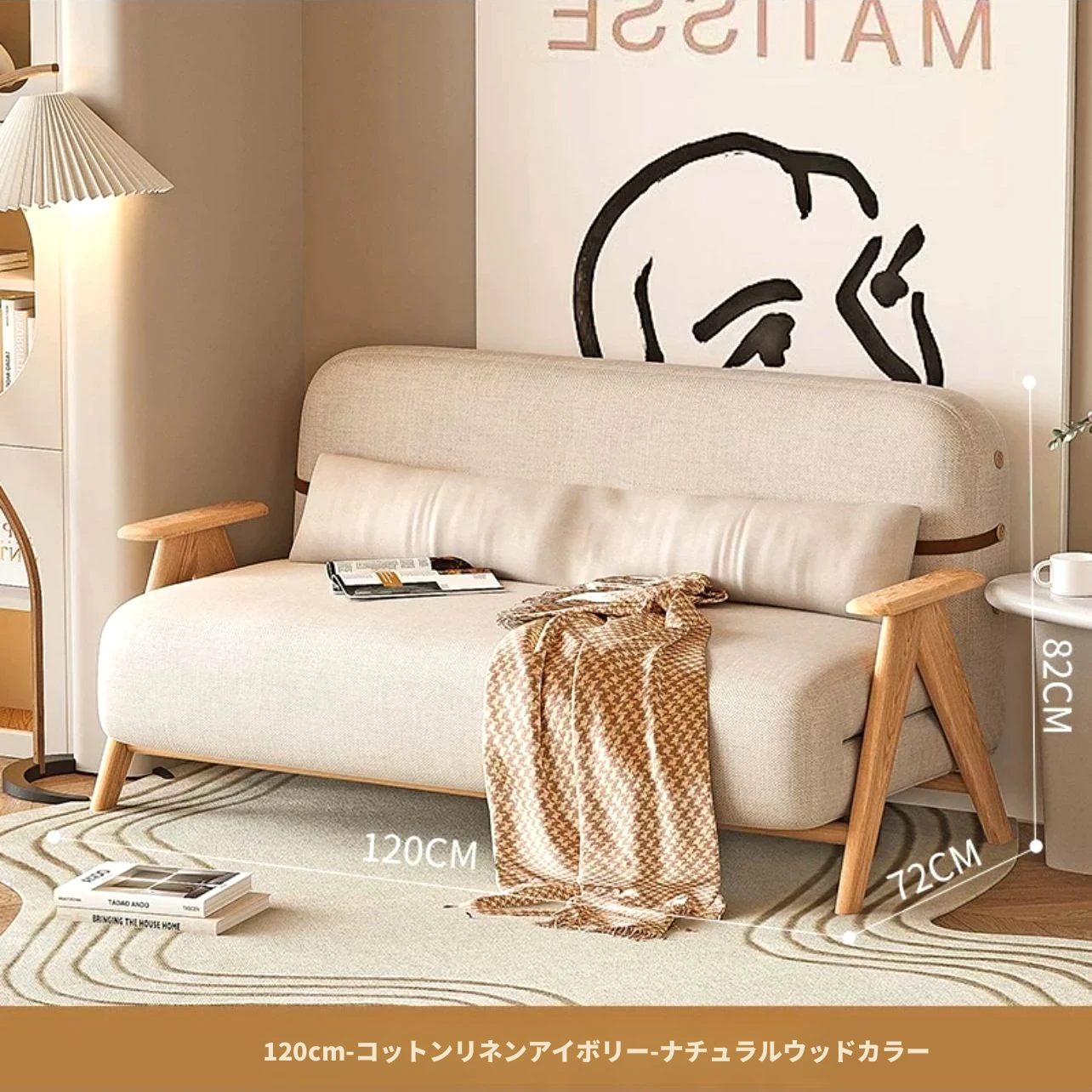 ダブルサイズ120cm/アイボリーソファベッド - 肌触りの良いリネン - 天然木風