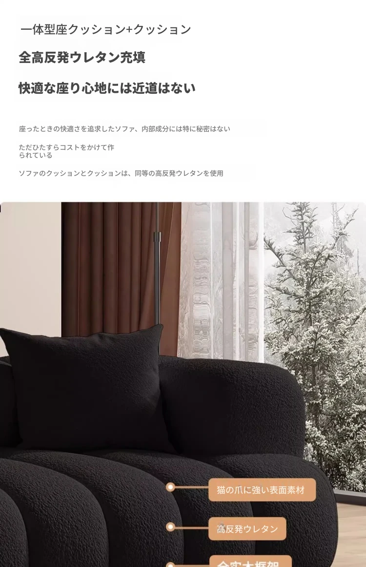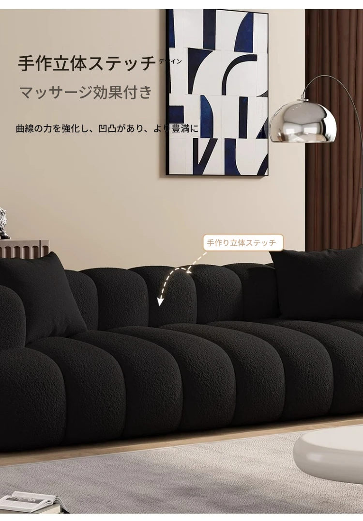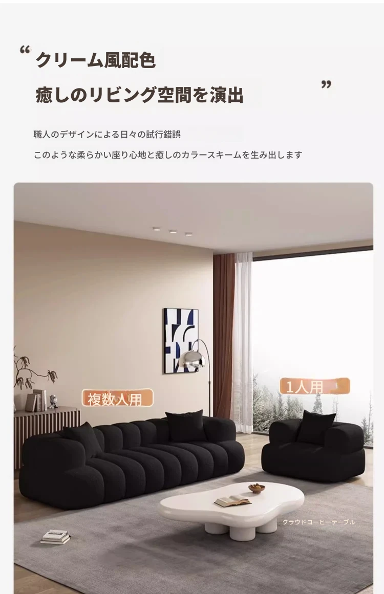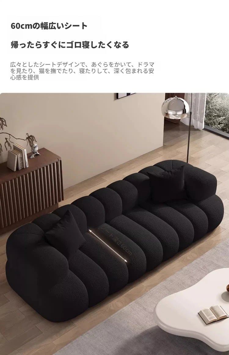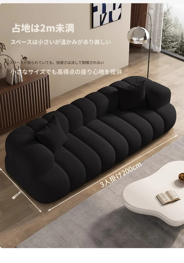 クリーミーな風合いのファブリックソファ|小型リビングに最適|ラムフリースのファッション店用|ダブル三人掛け|ふわふわ雲のようなコットンキャンディブラックソファで、心地よい空間を演出!