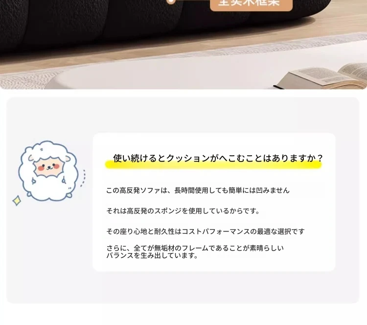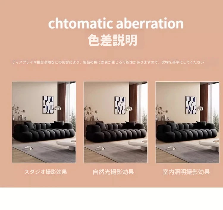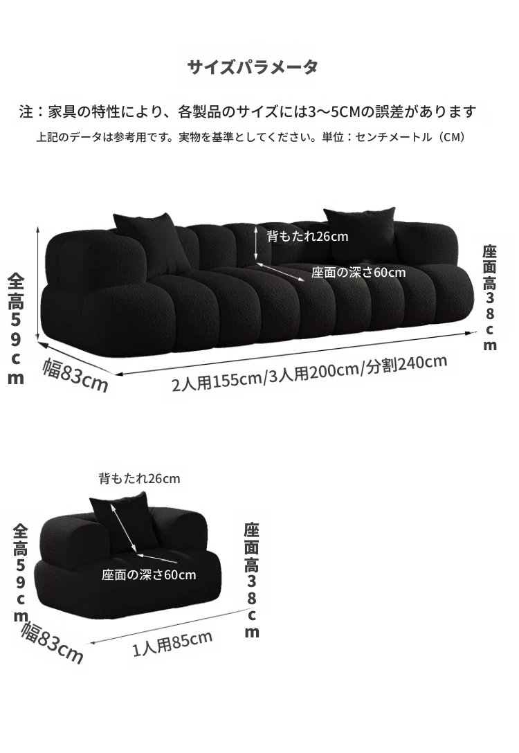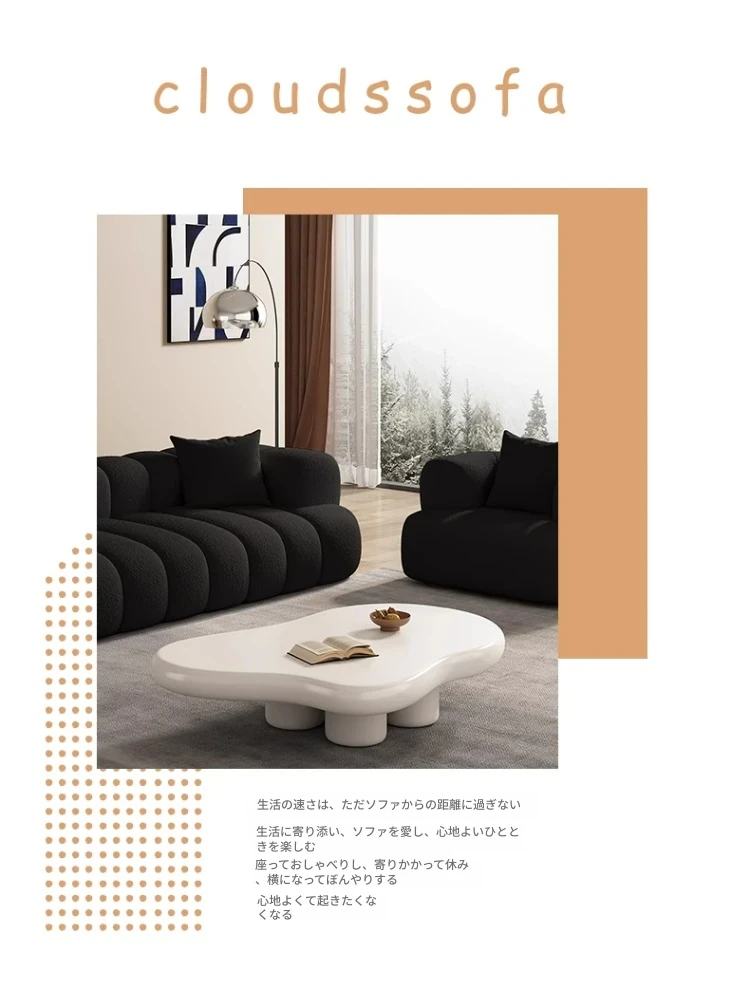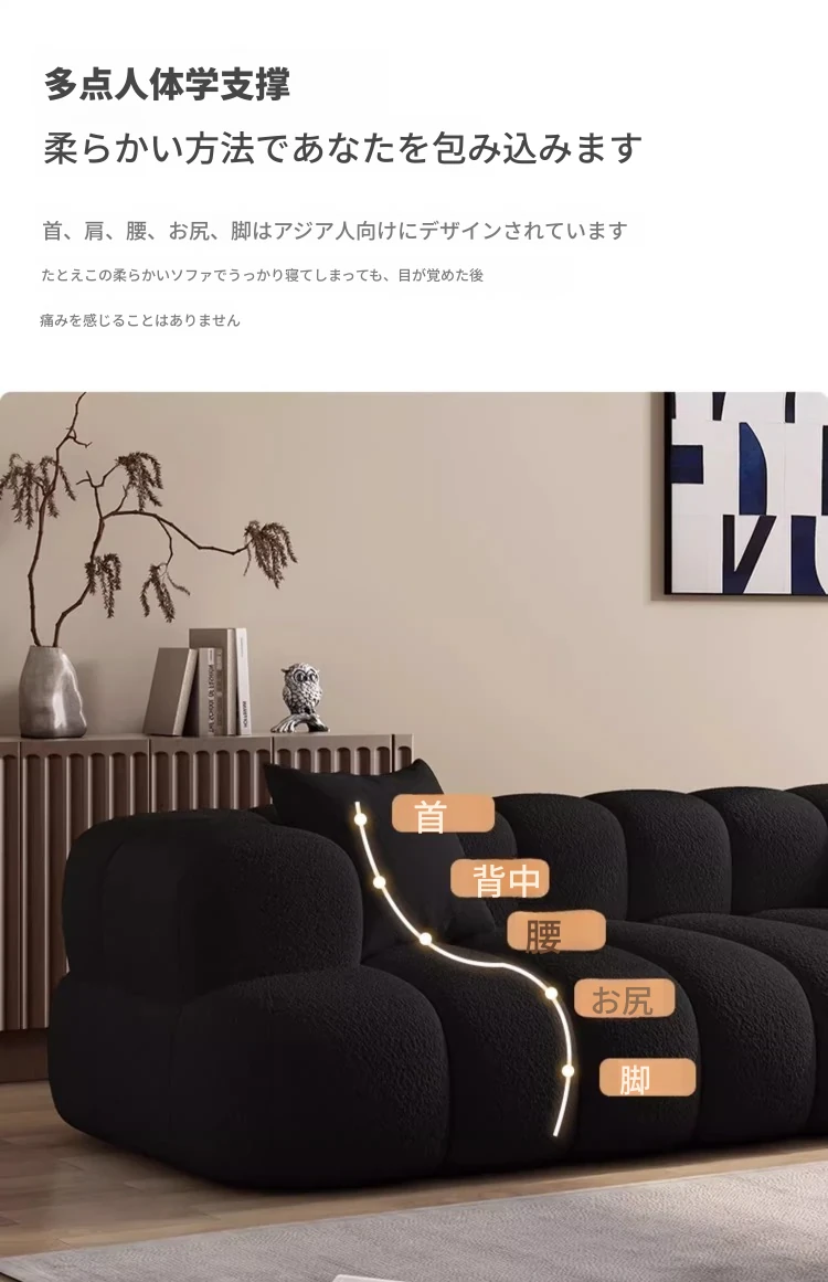 クリーミーな風合いのファブリックソファ|小型リビングに最適|ラムフリースのファッション店用|ダブル三人掛け|ふわふわ雲のようなコットンキャンディブラックソファで、心地よい空間を演出!