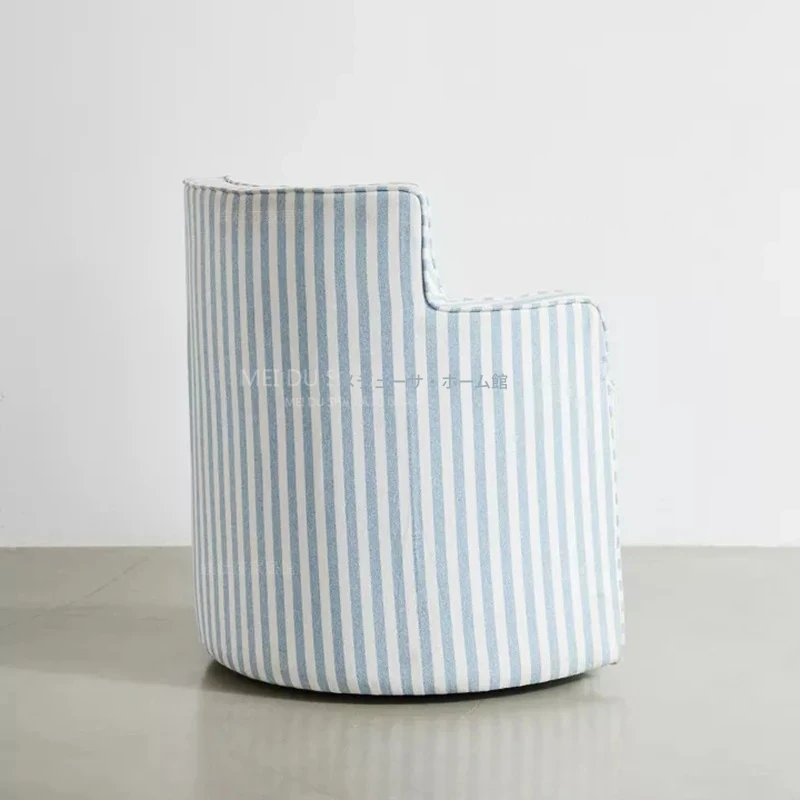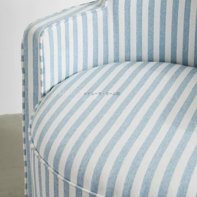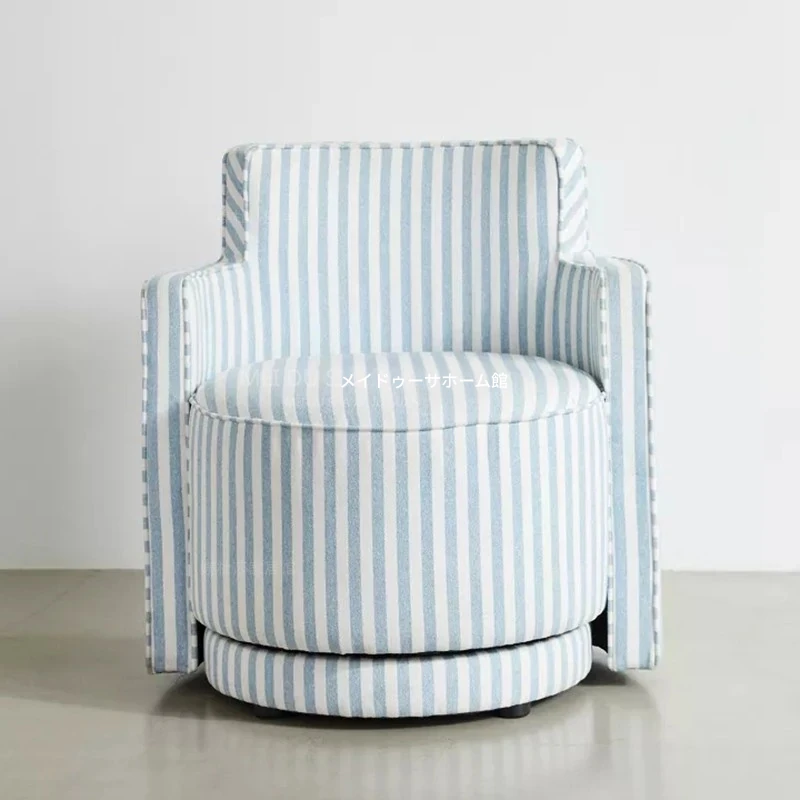 フレンチヴィンテージのブルー&ホワイトストライプの一人掛けソファ、アメリカンスタイルのラウンド布製小ソファチェア。リビングやバルコニー、寝室にぴったりのおしゃれなアイテム!