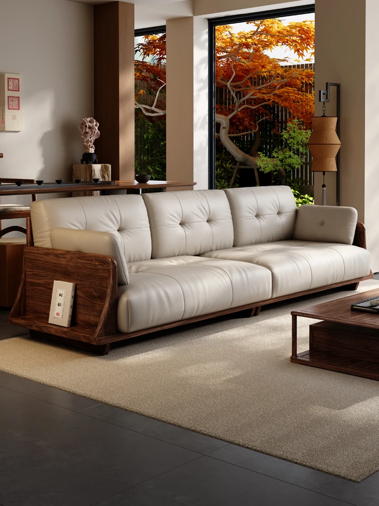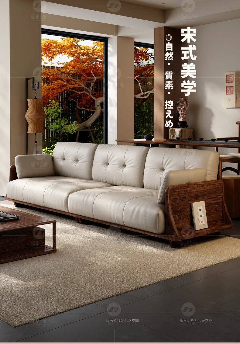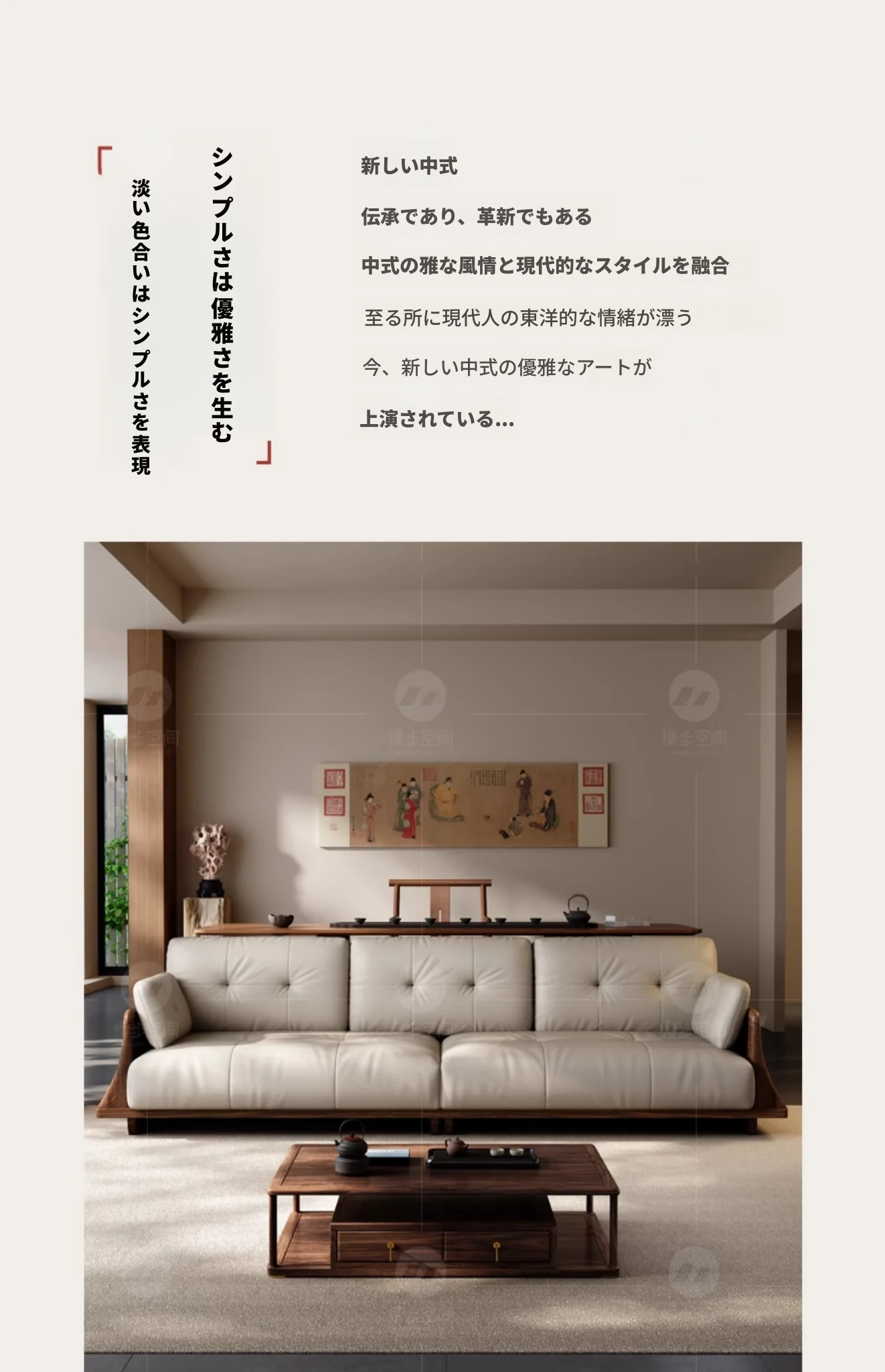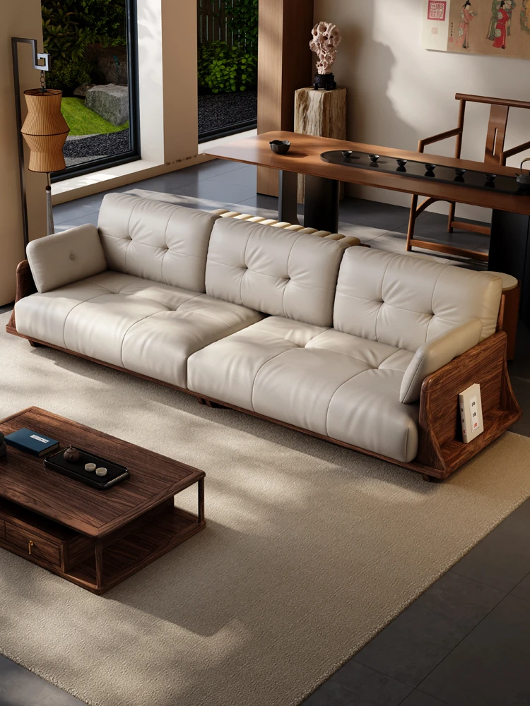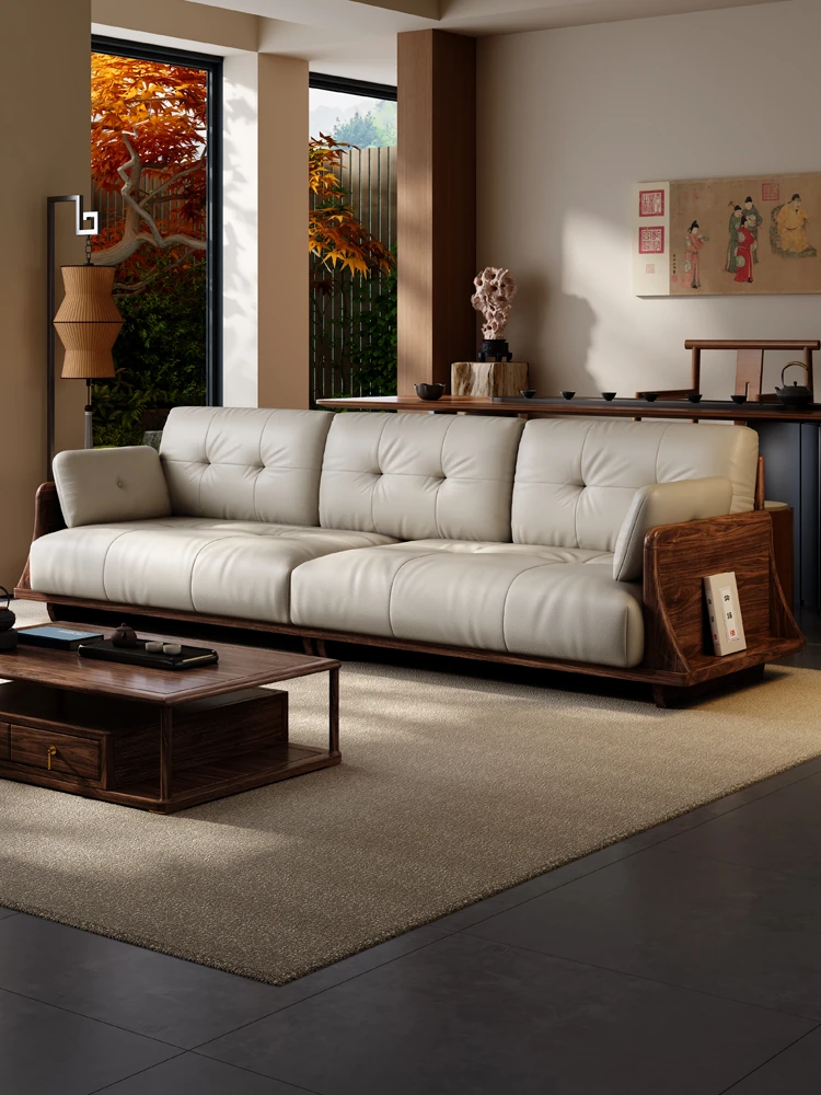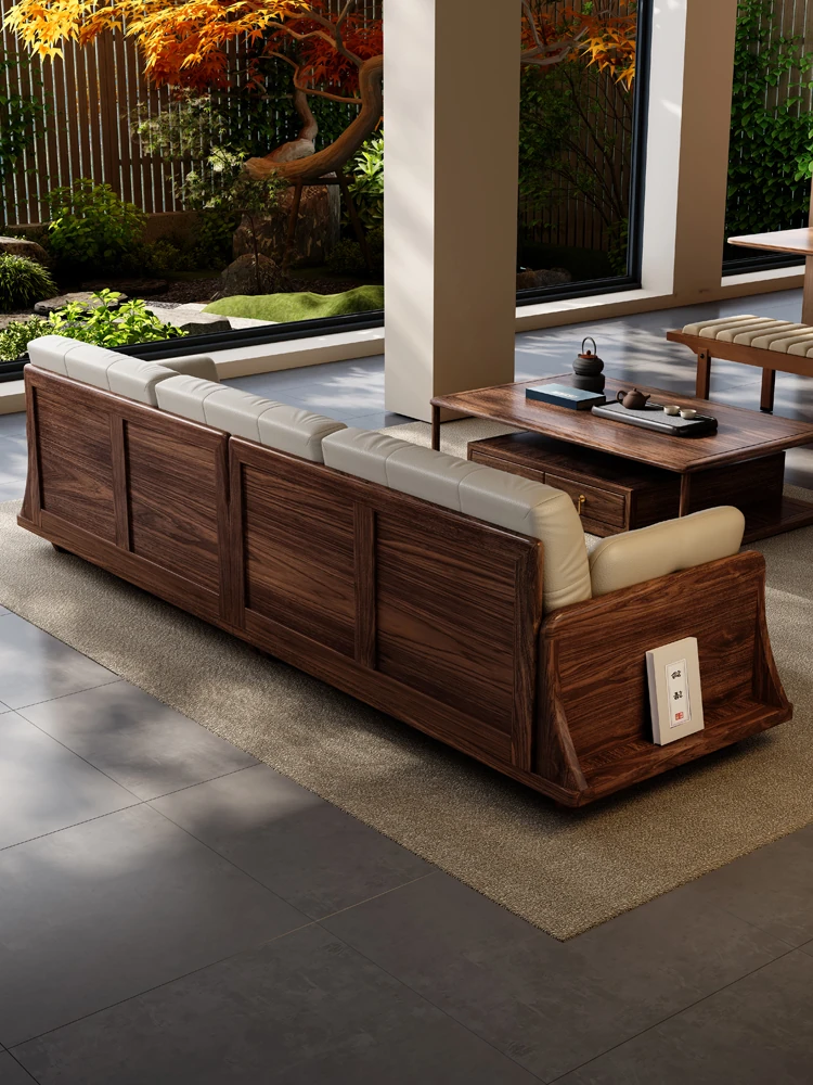 新中式ブラックウォールナット無垢材本革ソファセット 軽やかなラグジュアリー感のあるリビング用直列4人掛け 2025年新作家具で、洗練された空間を演出!
