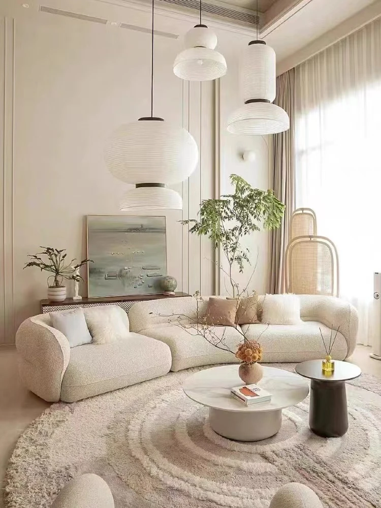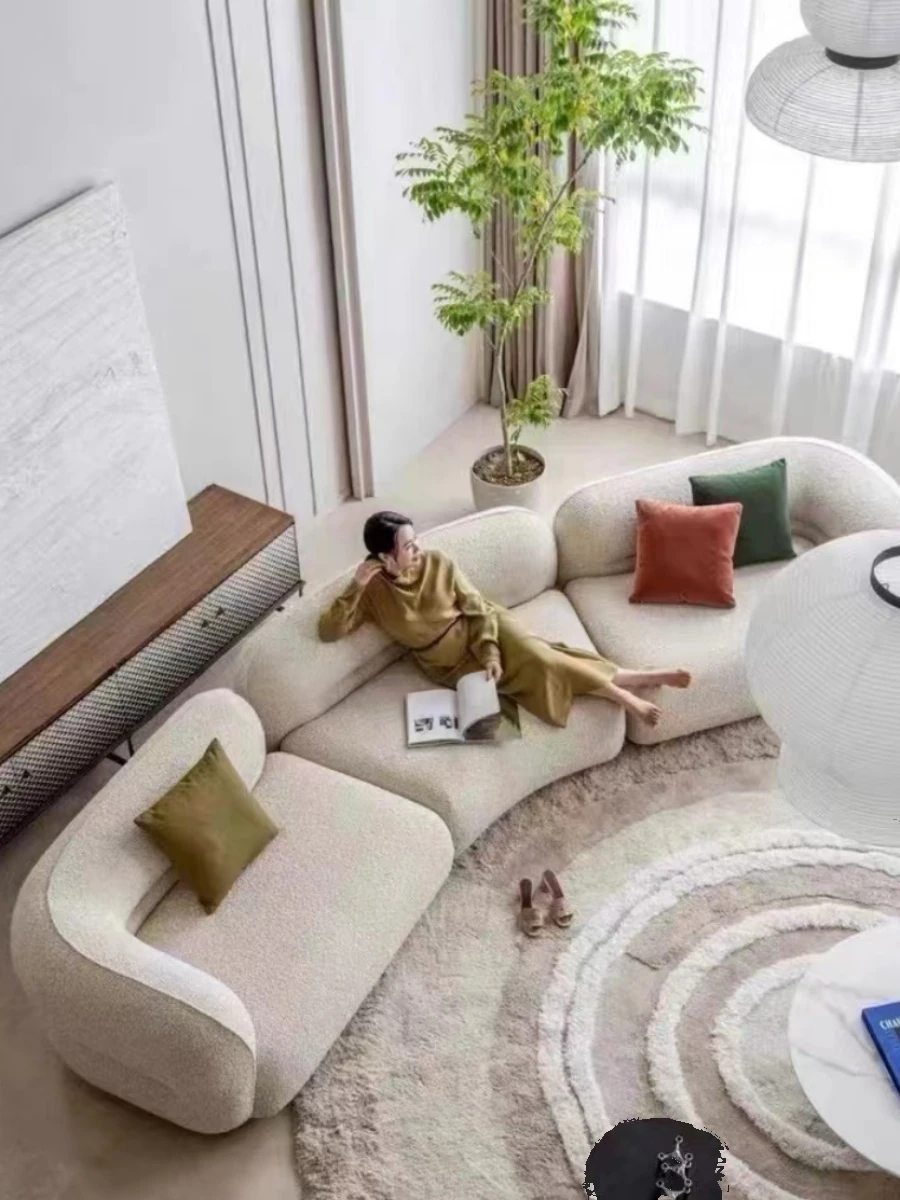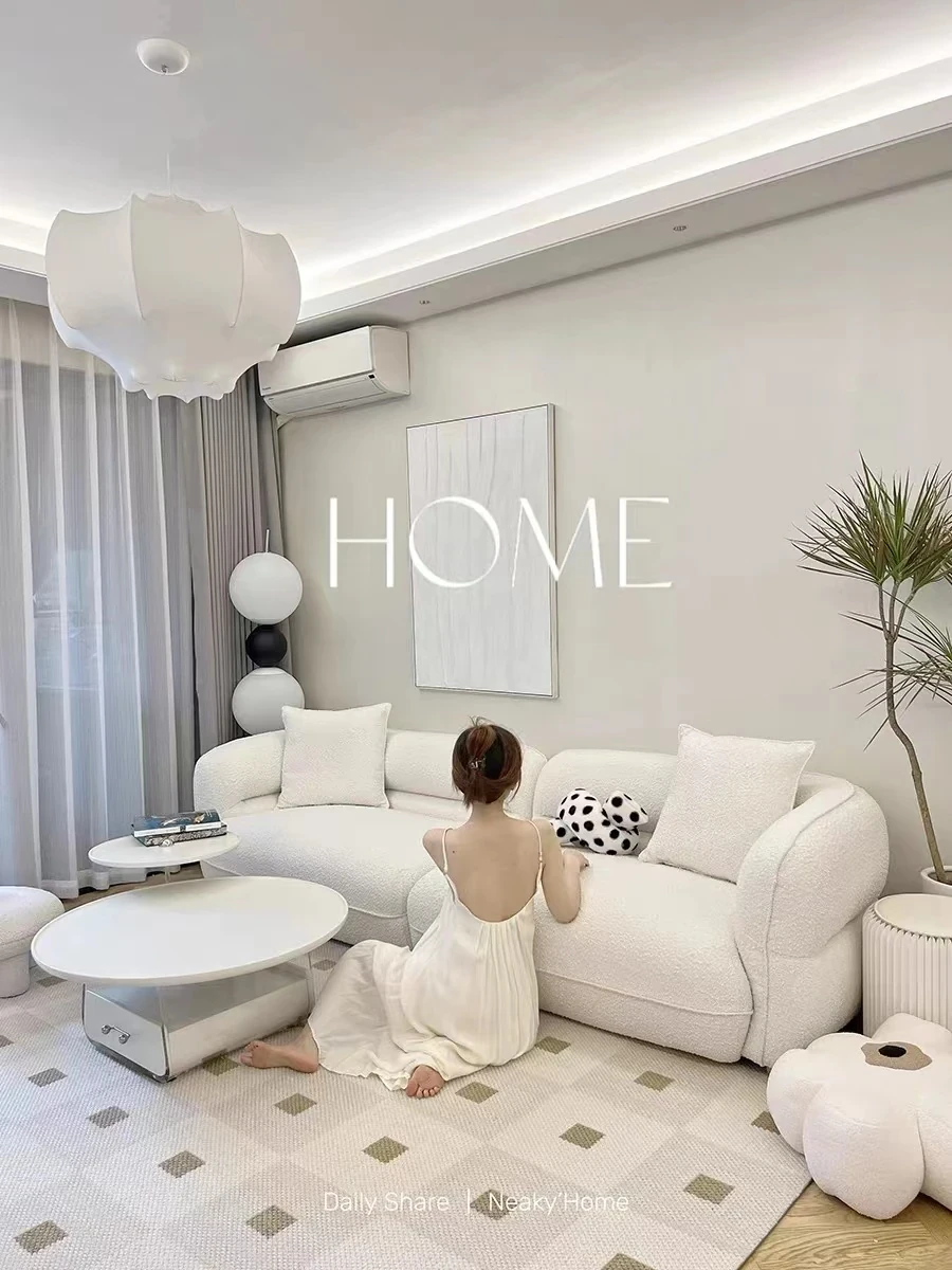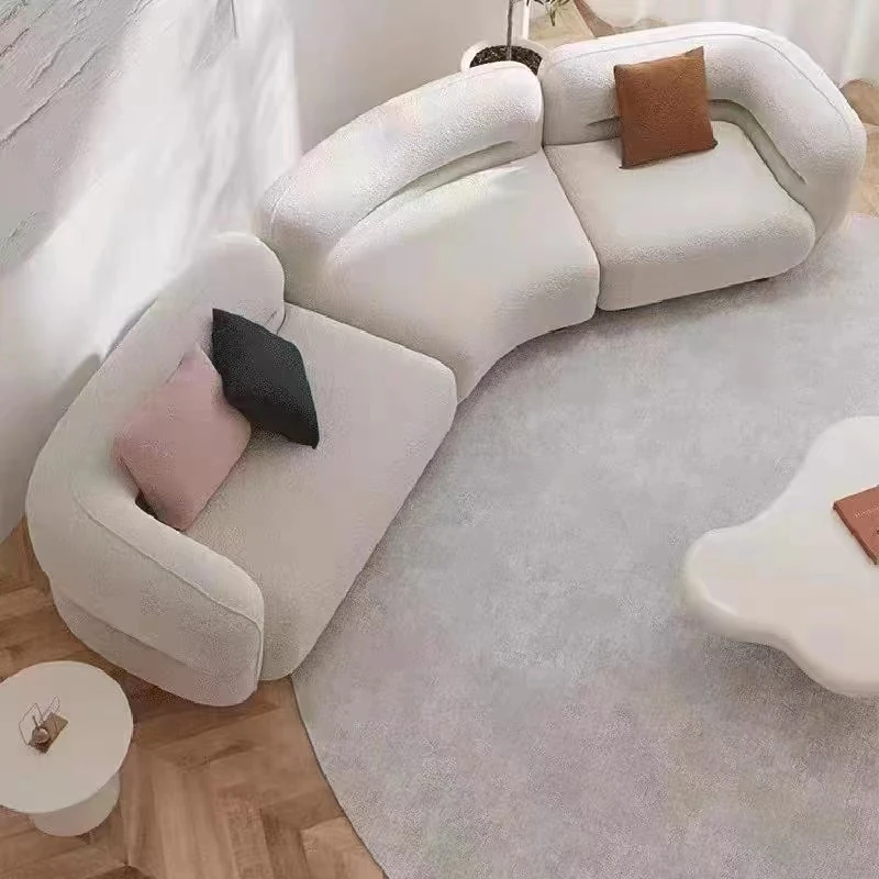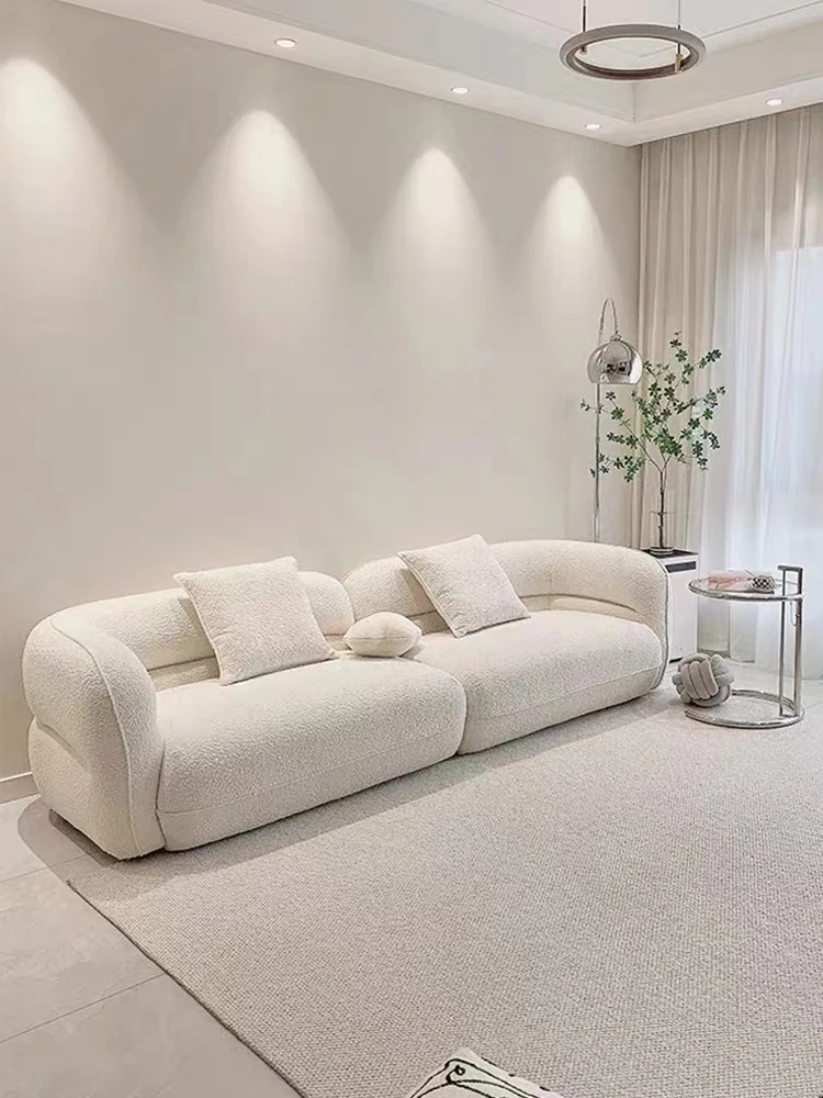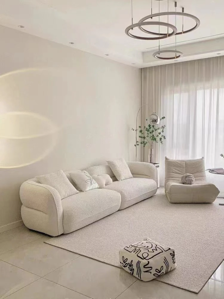 北欧風クリームカラーのラムファーソファ|デザイナーズ美容院向け|小型リビングにぴったりのシンプルでレトロなファブリックソファ