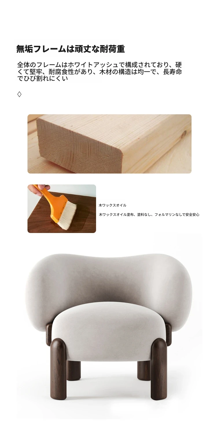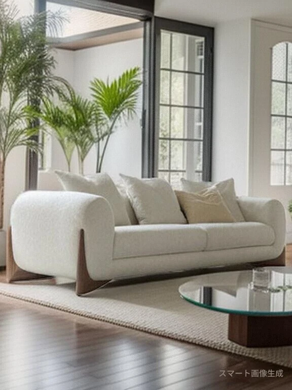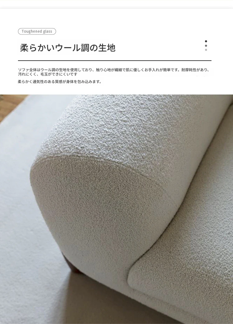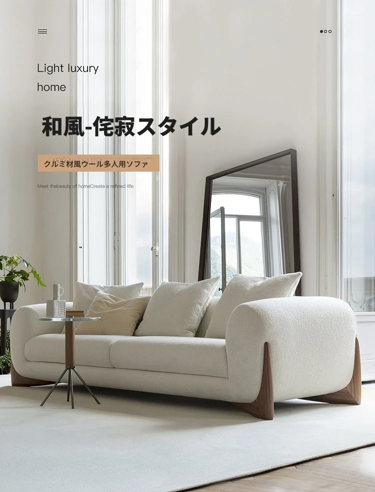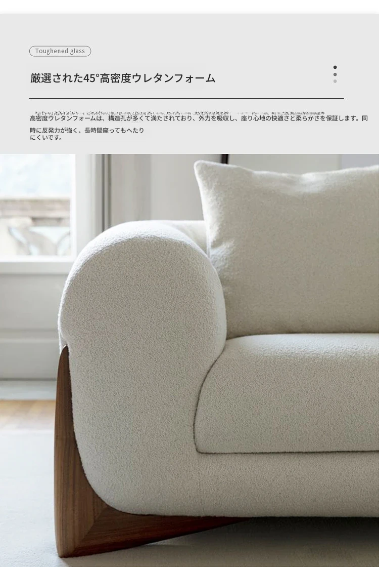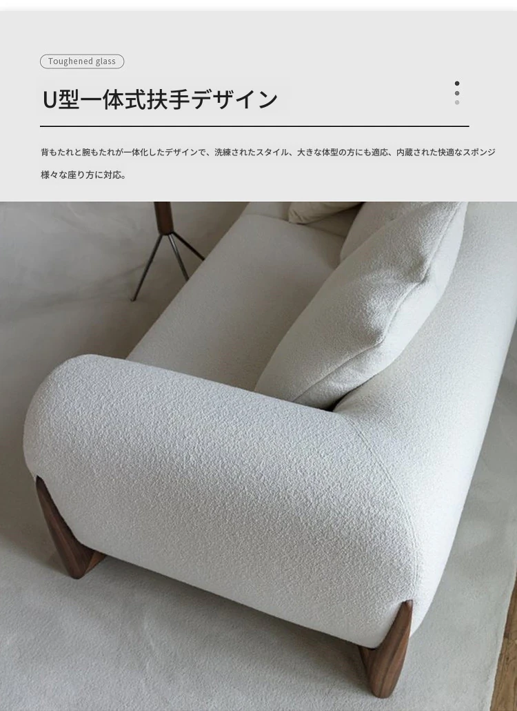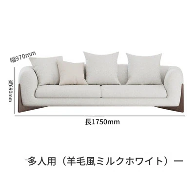 北欧スタイルのトレンディなリビングルーム用、シンプルでモダンな軽奢感漂うクリーミーホワイトのラムウール製マルチシートソファチェア。小さなお部屋にもぴったり!快適さと洗練されたデザインを両立。