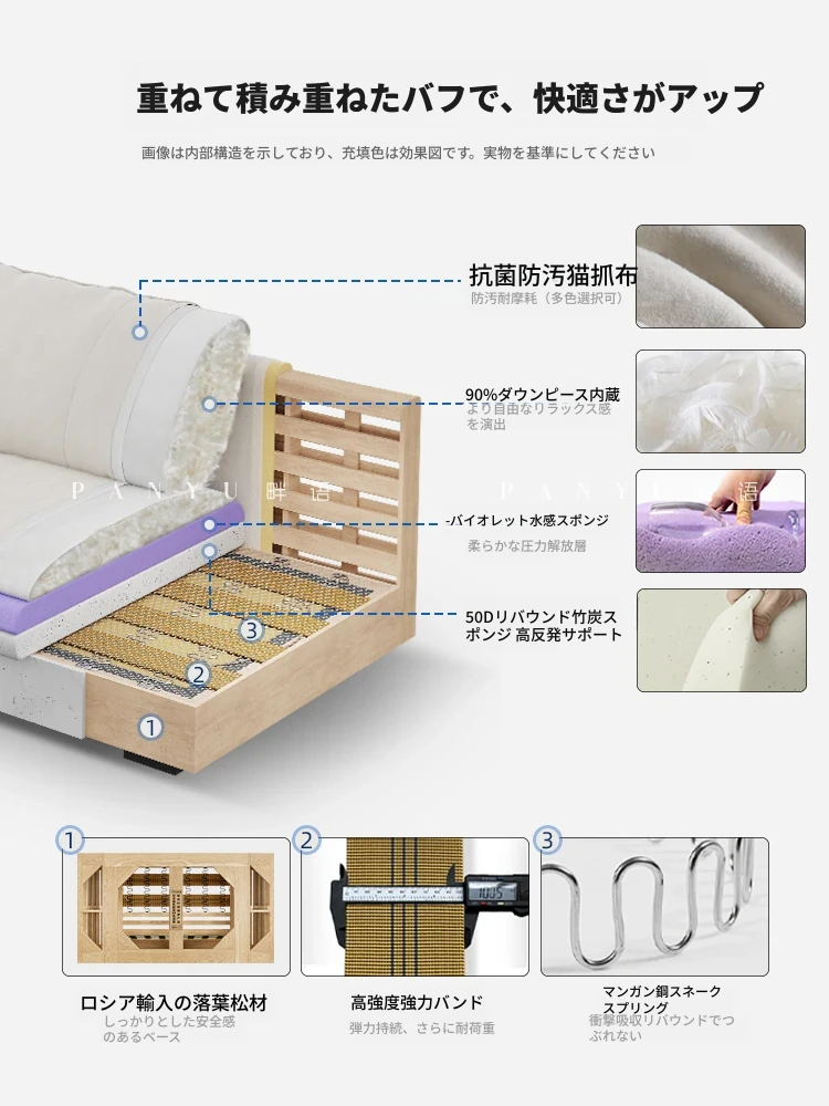 大3人掛け 2.6メートル【天然ダウン+3CMバイオレットスポンジ+高反発竹炭スポンジ】