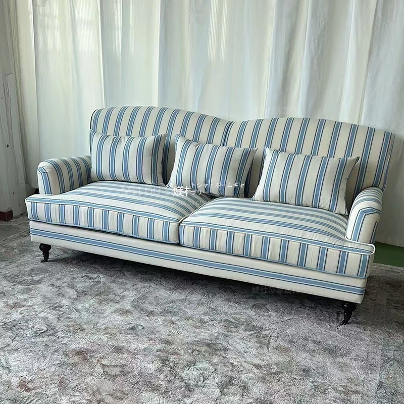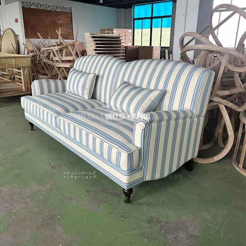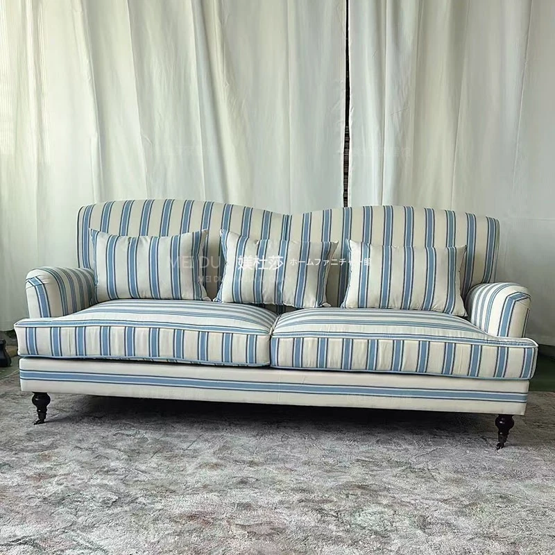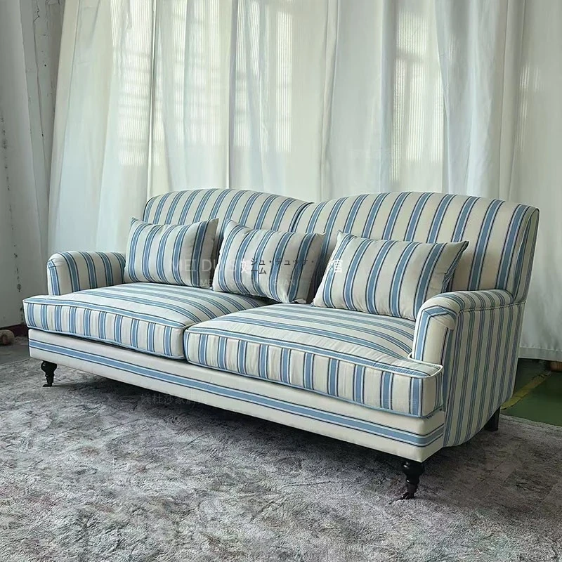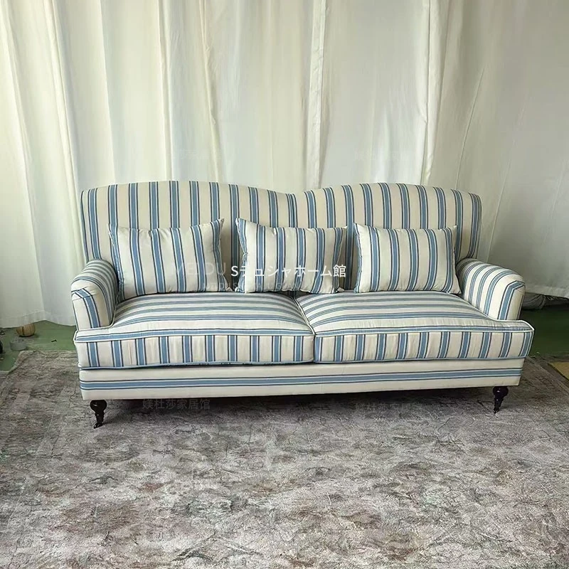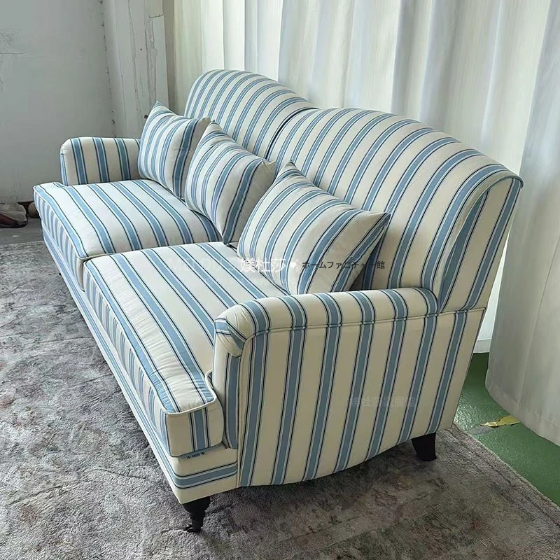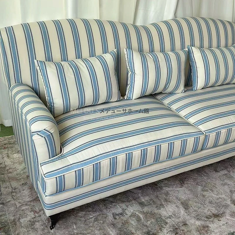 アメリカンビンテージブルー&ホワイトストライプの3人掛けソファ|フレンチ田園スタイルのリラックス空間にぴったり!高背デザインで小さなお部屋にも最適。おしゃれな客間を演出します!