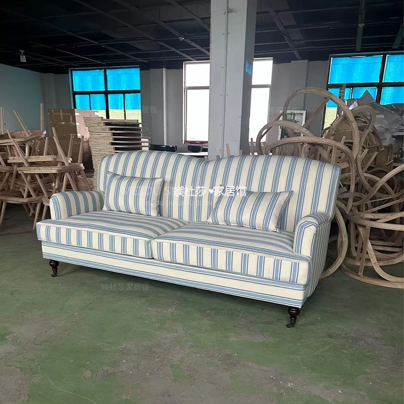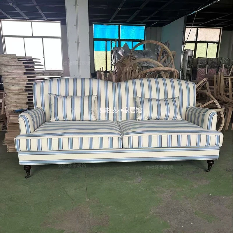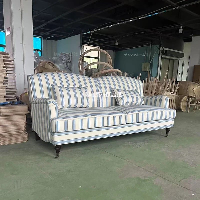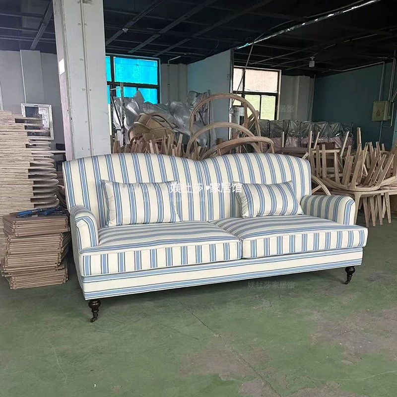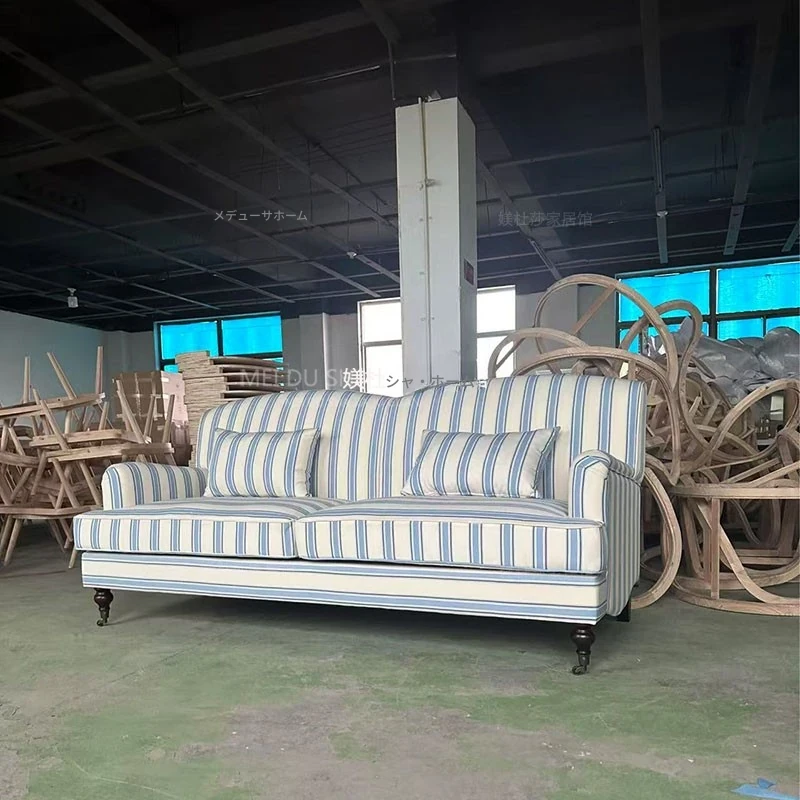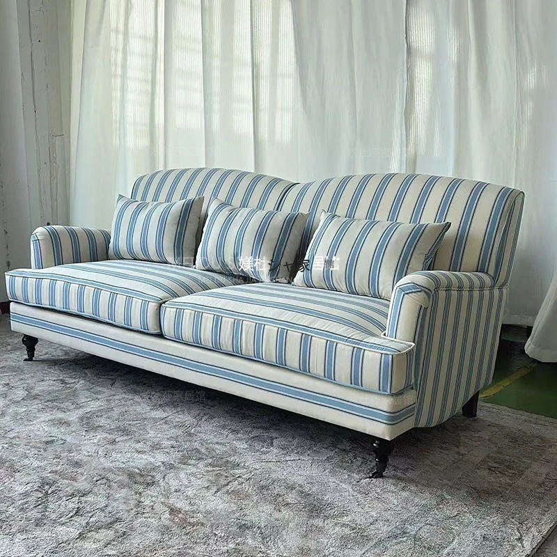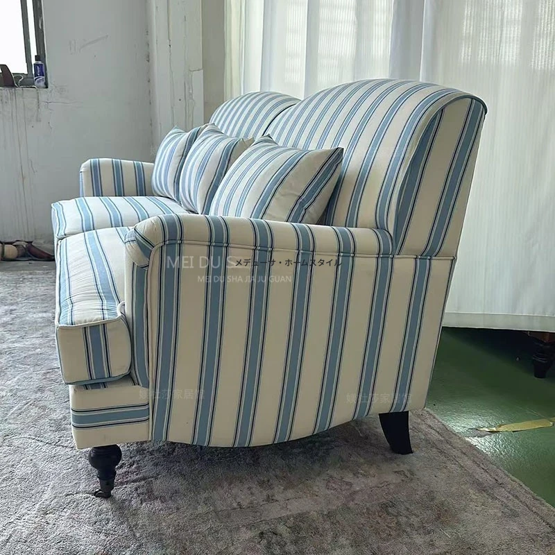 アメリカンビンテージブルー&ホワイトストライプの3人掛けソファ|フレンチ田園スタイルのリラックス空間にぴったり!高背デザインで小さなお部屋にも最適。おしゃれな客間を演出します!