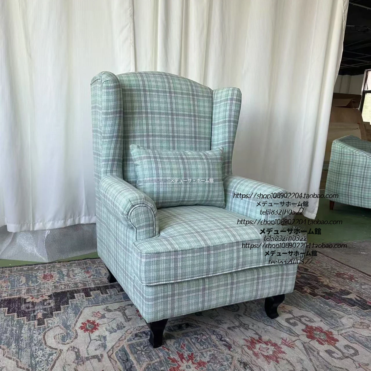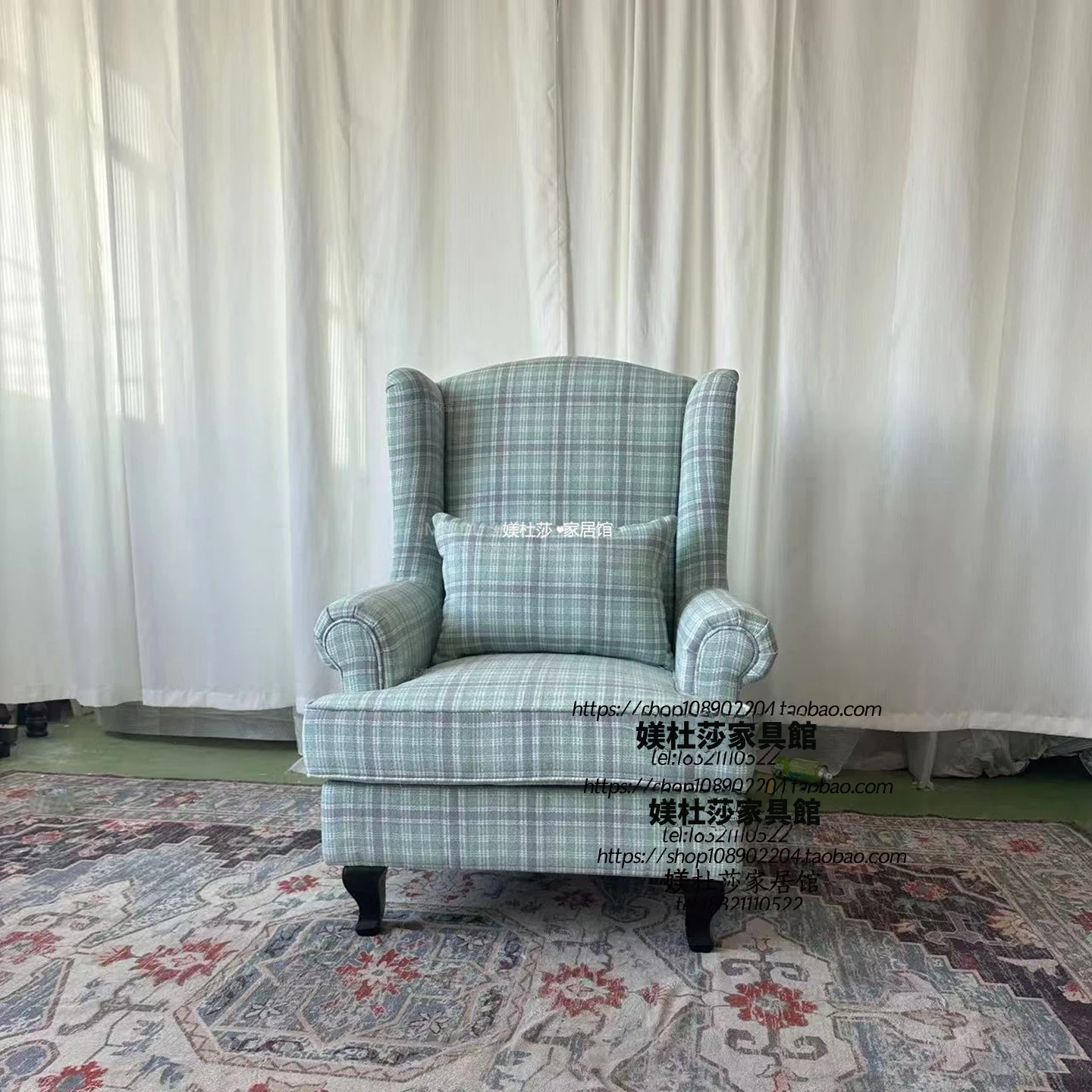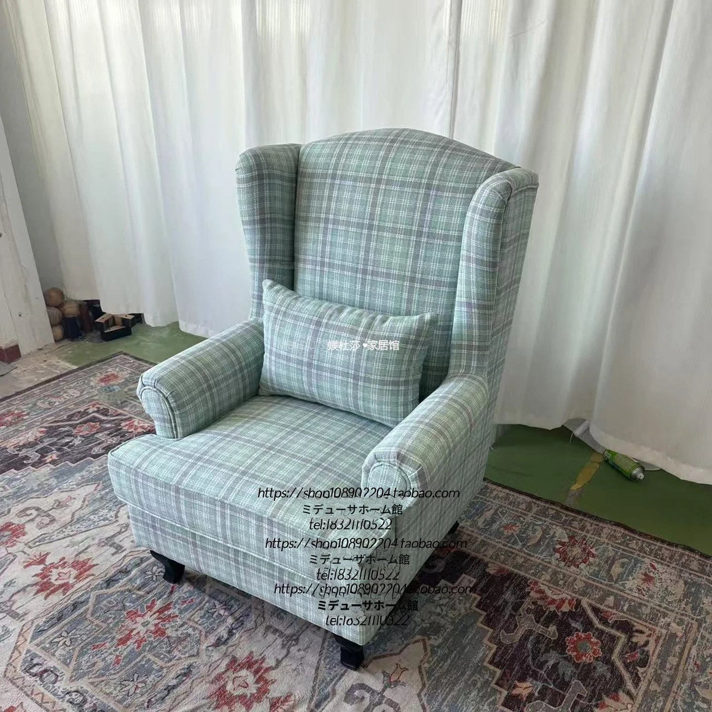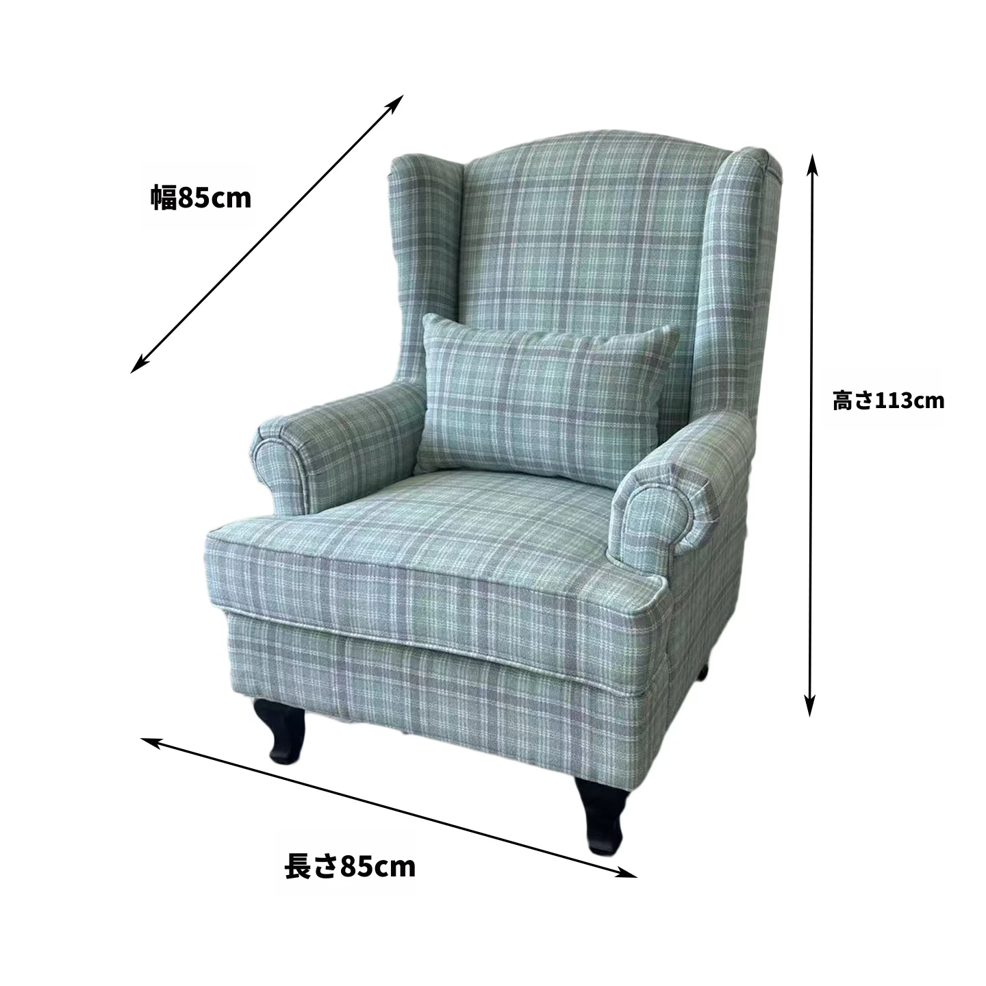 フレンチヴィンテージスタイルのグリーンチェックワンシートチェア|アメリカンカントリーリビングにぴったりのトラチェア|高背デザインでリラックスできるファブリックソファチェア