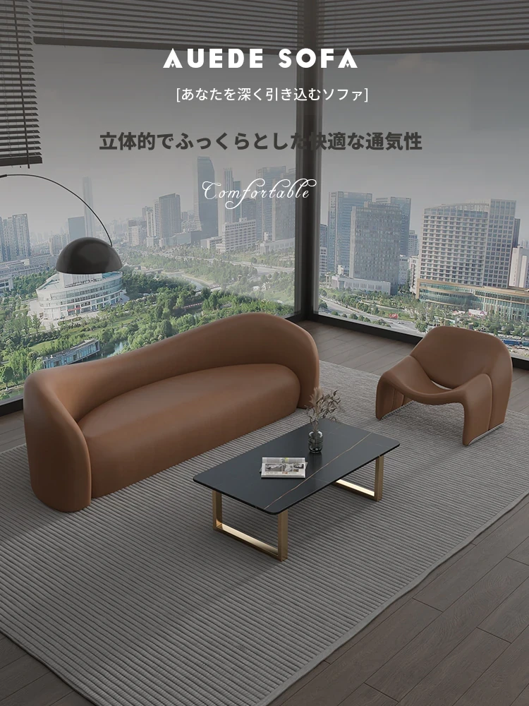 スタイリッシュなビジネス向け!高級感あふれる軽奢オフィス用レザーソファ、商談スペースやモデルルームに最適なシンプルなデザイン。リラックスできるカフェテーブルとのセットで、魅力的な空間を演出します。
